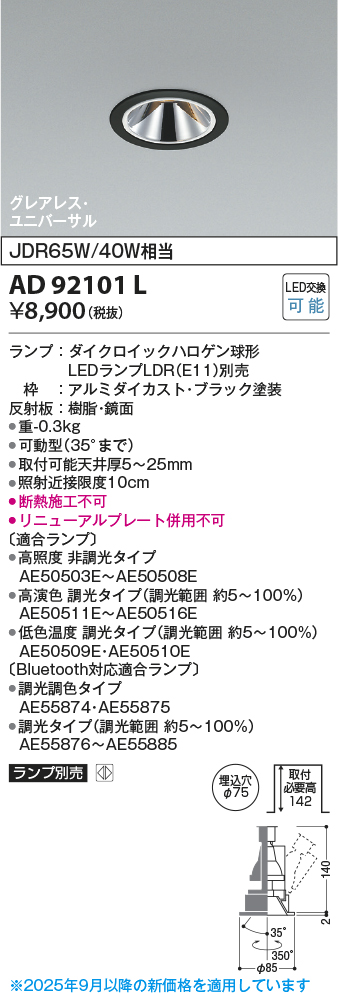 〔適合ランプ〕●高照度 非調光タイプ AE50503E~AE50508E●高演色 調光タイプ(調光範囲 約5~100%)AE50511E~AE50516E●低色温度 調光タイプ(調光範囲 約5~100%)AE50509E・AE50510E
