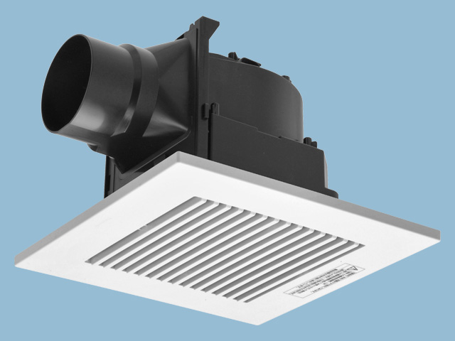 鋼板製の常時換気付・低騒音形本体とリニューアル用でひと回り大き目の樹脂製格子ルーバーとの組合せで、取替え時に天井面の汚れを覆い、
