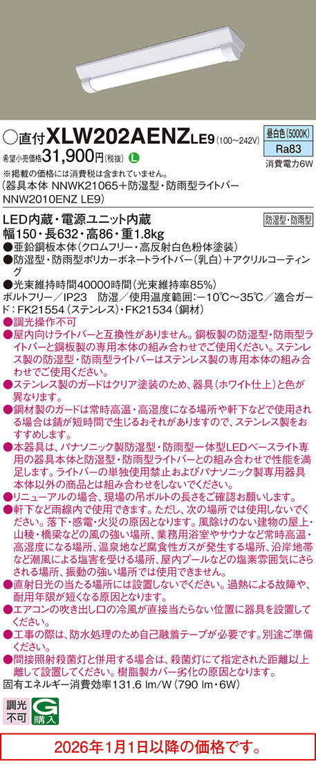 天井直付型 20形 一体型LEDベースライト 防湿型・防雨型 Dスタイル/富士型 直管形蛍光灯FL20形1灯器具相当 FL20形・800 lm(NNWK21065+NNW2010ENZLE9)