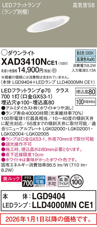天井埋込型 LED(昼白色) 傾斜天井用ダウンライト 美ルック・浅型8H・高気密SB形・拡散タイプ(マイルド配光) 埋込穴φ100 白熱電球100形1灯器具相当(LGD9404+LLD4000MNCE1)