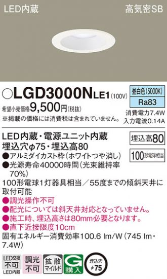 天井埋込型 LED(昼白色) ダウンライト 浅型8H・高気密SB形・拡散タイプ(マイルド配光) 埋込穴φ75 白熱電球100形1灯器具相当