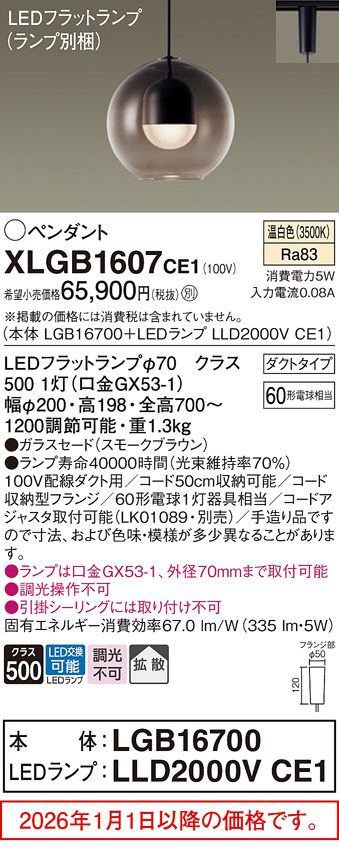 吊下型 LED(温白色) ペンダント ガラスセードタイプ・拡散タイプ・ダクトタイプ 白熱電球60形1灯器具相当(LGB16700+LLD2000VCE1)
