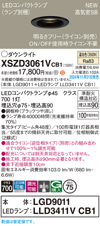 天井埋込型 LED(温白色) ダウンライト 浅型9H・高気密SB形・ビーム角48度・集光タイプ LEDコンパクトランプ交換型・調光タイプ(ライコン別売)/埋込穴φ75 白熱電球100形1灯器具相当(LGD9011+LLD3411VCB1)