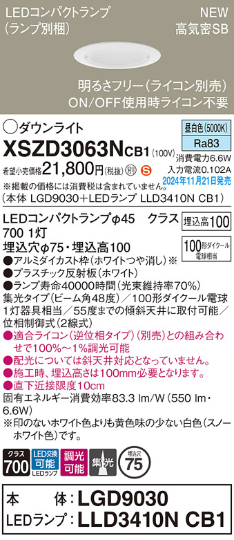 天井埋込型 LED(昼白色) ダウンライト 浅型10H・高気密SB形・ビーム角48度・集光タイプ LEDコンパクトランプ交換型・調光タイプ(ライコン別売)/埋込穴φ75 110Vダイクール電球100形1灯器具相当(LGD9030+LLD3410NCB1)