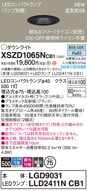 天井埋込型 LED(昼白色) ダウンライト 浅型10H・高気密SB形・ビーム角48度・集光タイプ LEDコンパクトランプ交換型・調光タイプ(ライコン別売)/埋込穴φ75 110Vダイクール電球60形1灯器具相当(LGD9031+LLD2411NCB1)