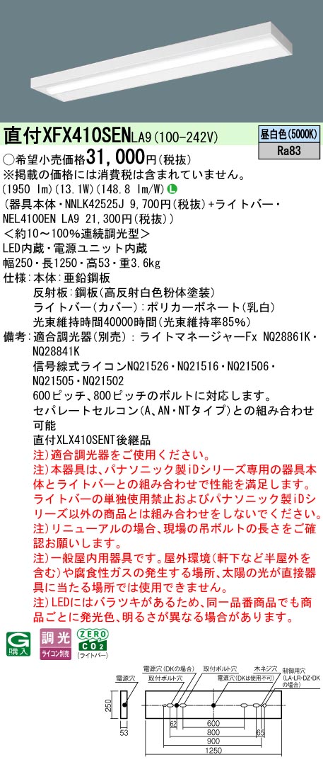 天井直付型 40形 一体型LEDベースライト 連続調光型調光タイプ(ライコン別売) スリムベース 直管形蛍光灯FLR40形1灯器具相当 FLR40形・2000 lm(節電)(NNLK42525J+NEL4100ENLA9)