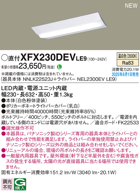 天井直付型 20形 一体型LEDベースライト Dスタイル/富士型 Hf蛍光灯16形高出力型2灯器具相当 Hf16形高出力型2灯・3200 lm(NNLK22523J+NEL2300EVLE9)