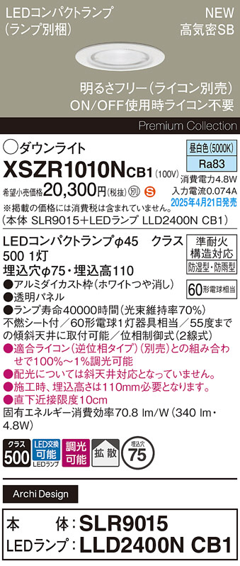 天井埋込型 LED(昼白色) 軒下用ダウンライト・ポーチライト 高気密SB形・拡散タイプ LEDコンパクトランプ交換型・防湿型・防雨型・調光タイプ(ライコン別売)/埋込穴φ75 パネル付型 白熱電球60形1灯器具相当(SLR9015+LLD2400NCB1)