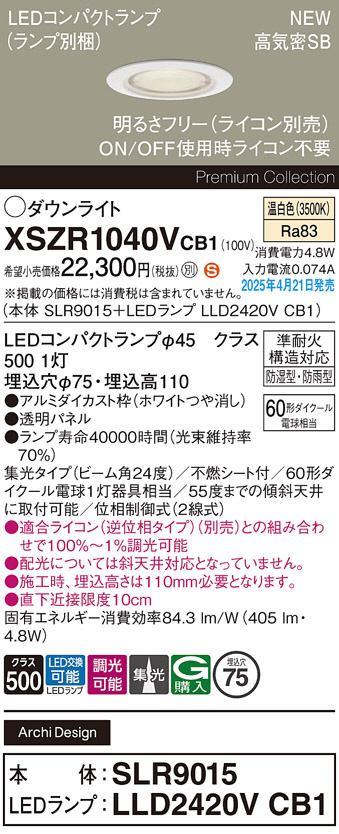天井埋込型 LED(温白色) 軒下用ダウンライト・ポーチライト 高気密SB形・ビーム角24度・集光タイプ LEDコンパクトランプ交換型・防湿型・防雨型・調光タイプ(ライコン別売)/埋込穴φ75 パネル付型 110Vダイクール電球60形1灯器具相当(SLR9015+LLD2420VCB1)